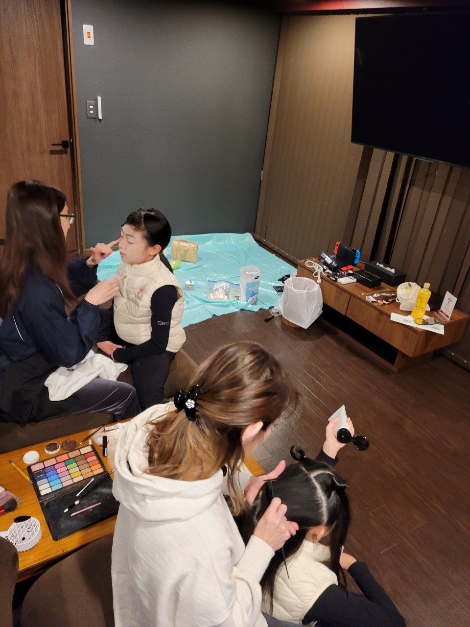 前日、抜き打ちお部屋を覗きに行ったら。。。 こちらをみんなで書いていてくれました。 ありがとう❣️ トップバッターの明咲。 完全に脳みそは寝てます笑 ちょっと前までこんなでしたからね笑笑 広々リビングでスタート。 章代先生のヘアセットは人使いが荒いんです笑 ジェルを手に章代先生がクシを差し出したらジェルを載せなければいけません。せっかち章代先生なので少しでも遅いと「ほれ!!」と急かされます。。。 前日に悠ママと奏羽ママが買い出しに行ってくれた朝ごはんをパクパク。。。優音は食べ過ぎで章代先生に怒られました笑 8:40になり一便の子供たちと章代先生でタクシーに乗り込み劇場へ。