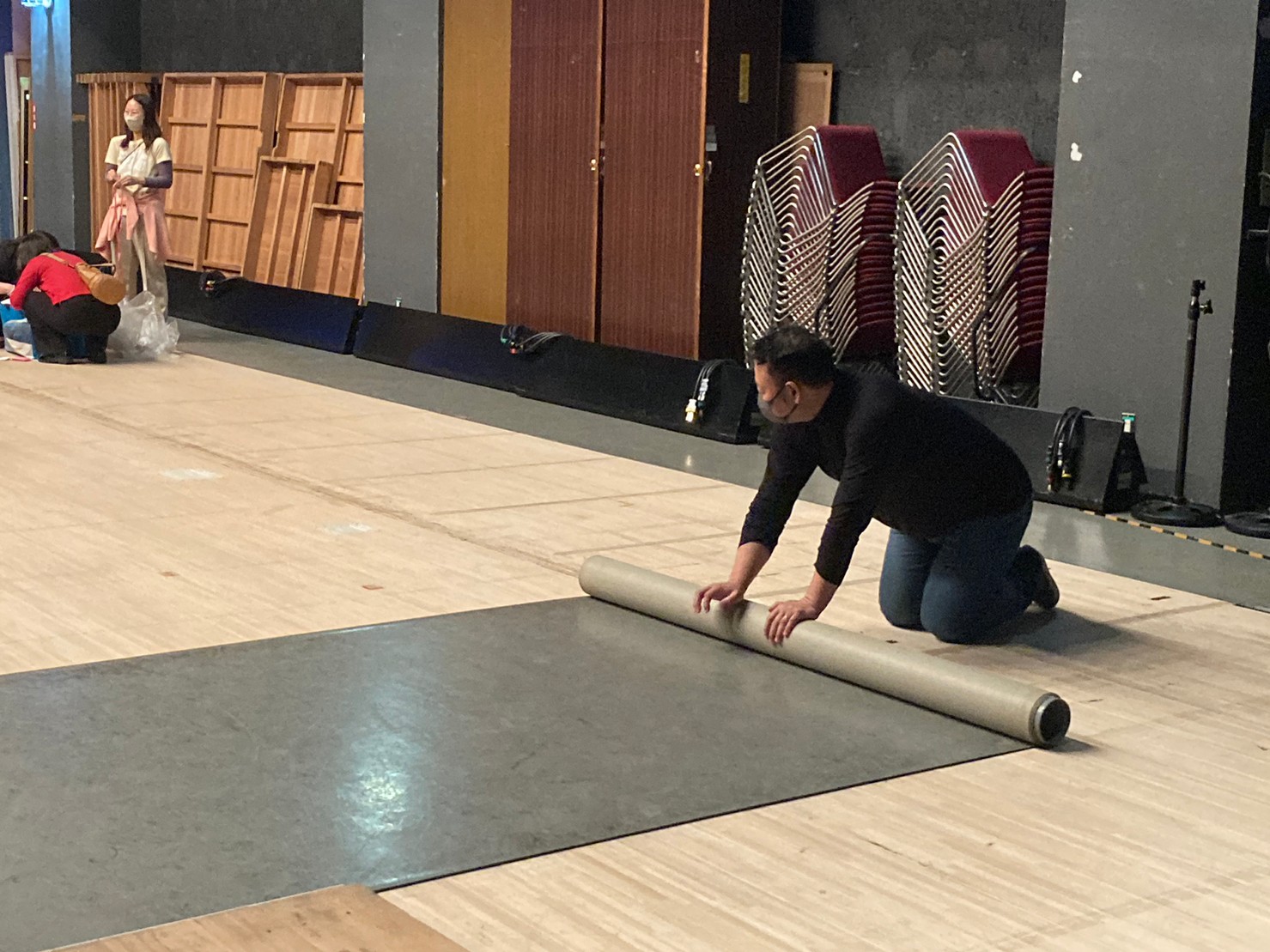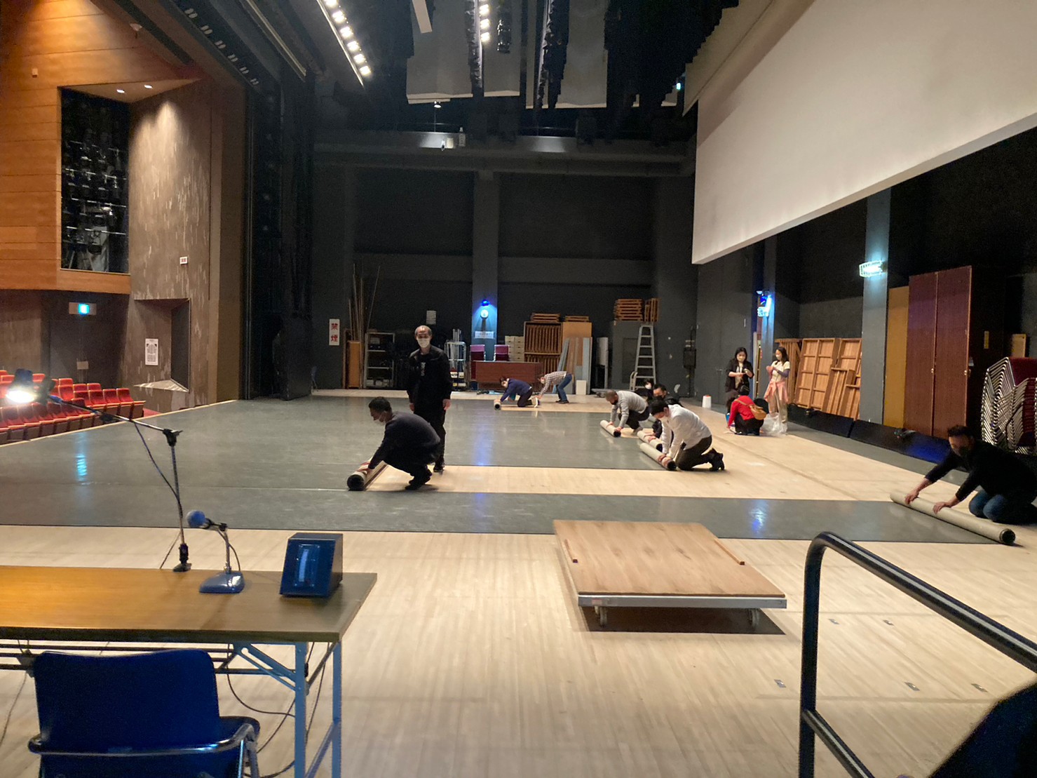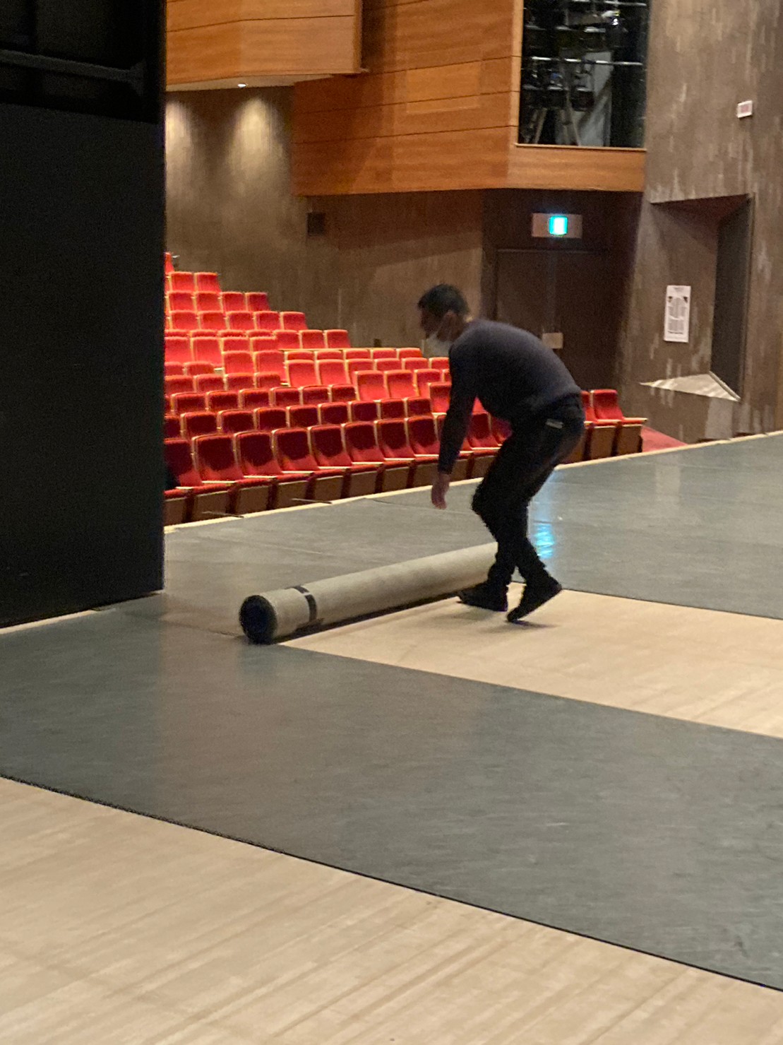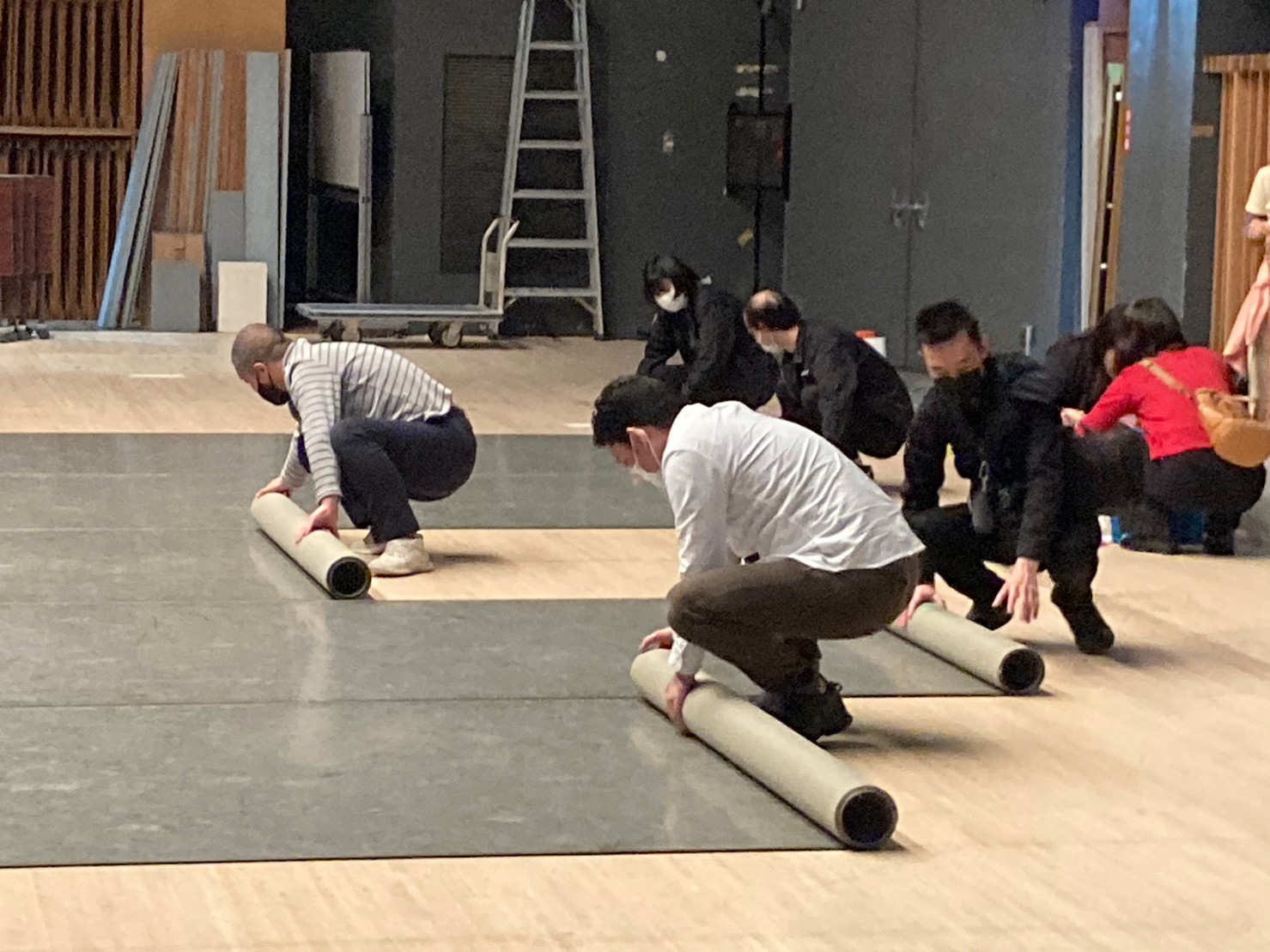 同時にパパさんと力持ちママさんたちで舞台面はリノリウム敷き作業。こちらも滞りなくさくさく進み、9時からは各チームの場当たりもできました。