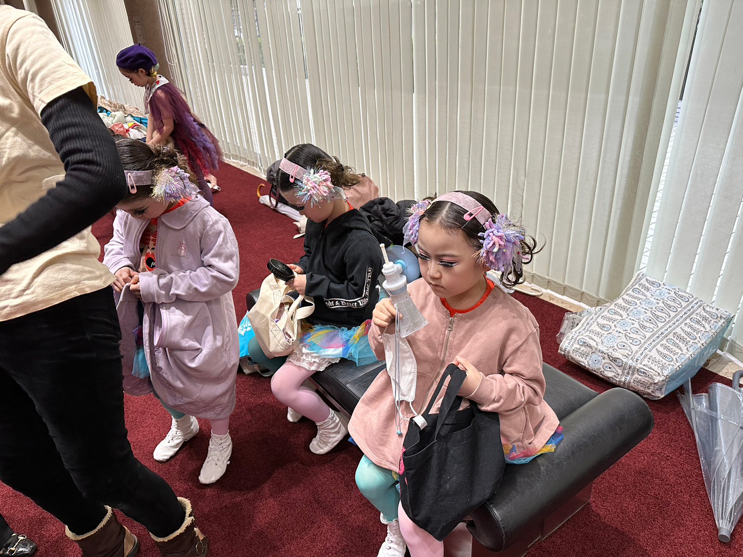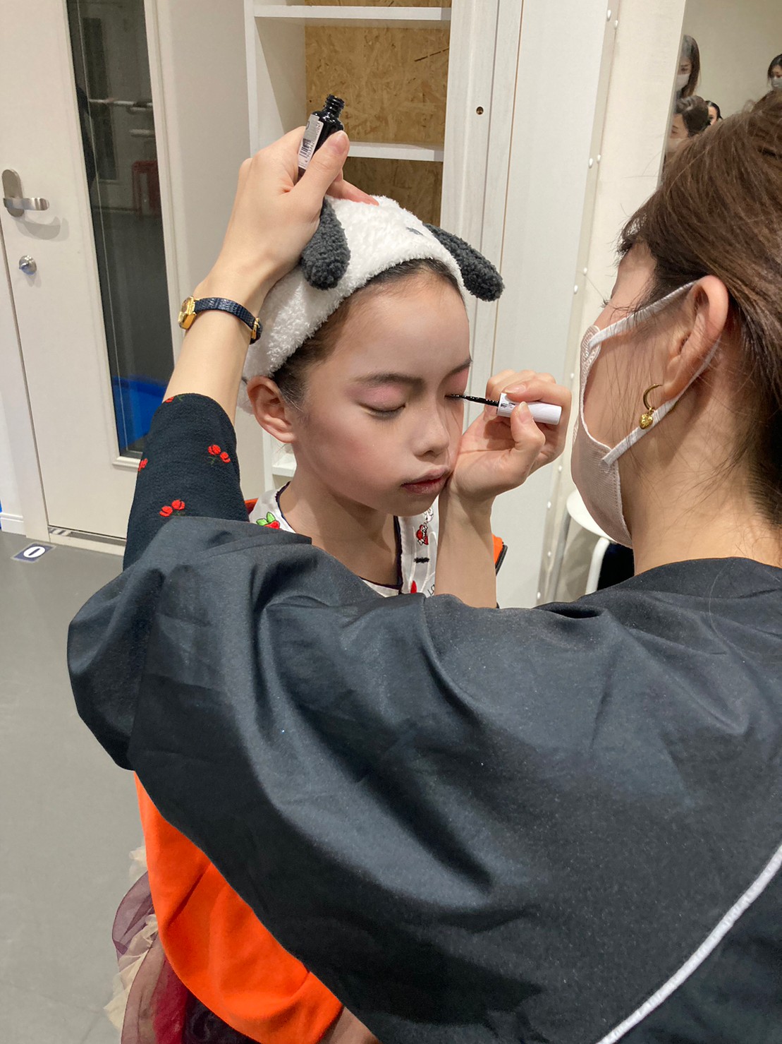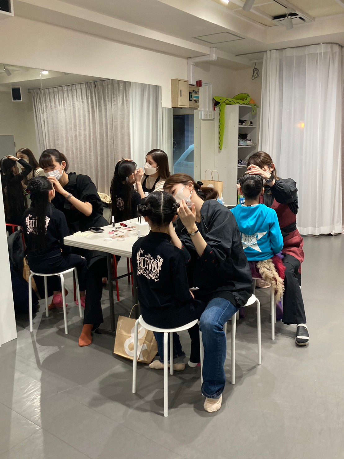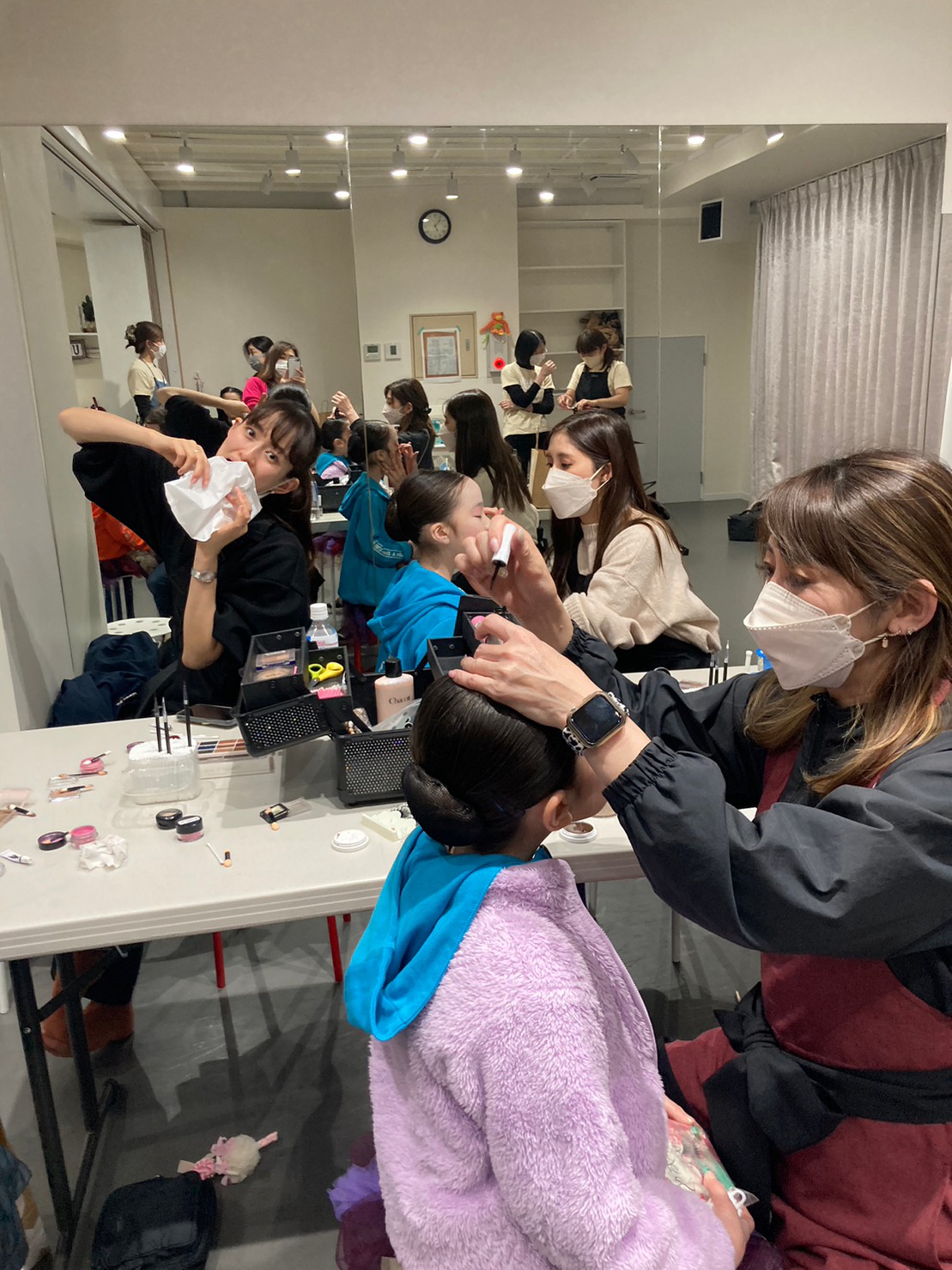 早々に劇場へ移動し、ロビーにてヘア&メイク開始。ベースメイクに温代も入ってもらい、章代先生ルボタンだけなら1人3分ほどで行けちゃいます。その技を麻衣先生に伝授したらすぐにマスターしてくれて超早く終わりました。
